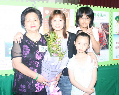 長青組的陳金桂由女兒楊惠如、孫女連于瑄一起陪同來參加初賽,貼心的女兒在媽媽表演完畢時,趕緊送上一束鮮花,提前祝福媽媽母親節快樂!楊惠如讚美媽媽非常愛唱歌,是全家唱得最好的一位,一席話讓媽媽陳金桂笑得眼笑眉也笑~~哇!原來她是明星張瓊姿的阿姨,都有一雙漂亮媚眼耶! |