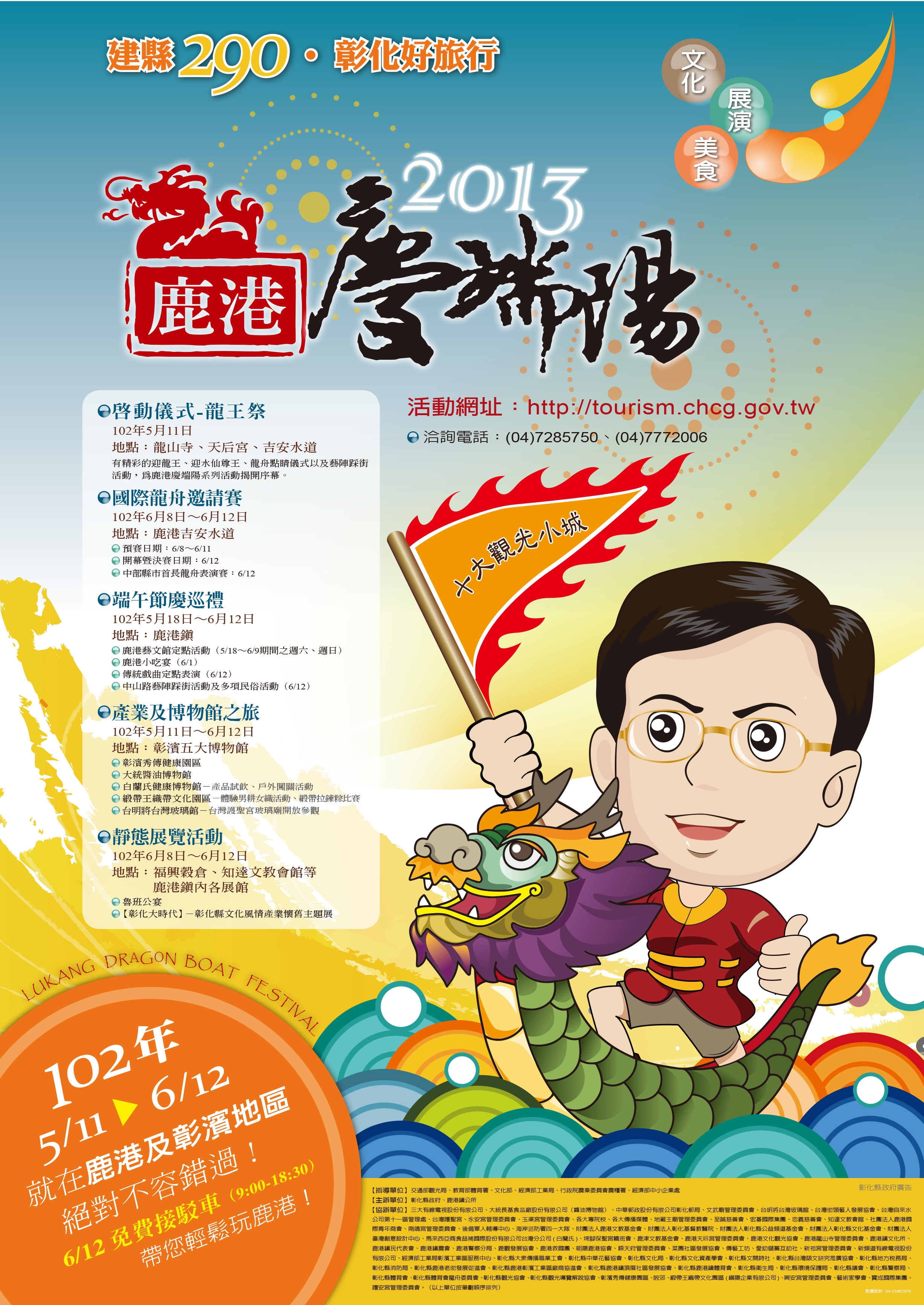 6月12日端午節當天將舉辦國際龍舟邀請賽決賽,由最受注目的中部縣市首長暨民意代表隊與葡萄公主、花YOUNG時代少女進行龍舟友誼賽暨表演賽,此外更可免費暢遊彰濱地區五大博物館,體驗台明將台灣玻璃館、秀傳紀念醫院健康園區、白蘭氏健康博物館、緞帶王織帶文化園區、大統醬油博物館等所規劃各項參觀活動,端午節當天縣府備有免費接駁車,歡迎全國鄉親多加利用,相關資訊請上網查詢,網址