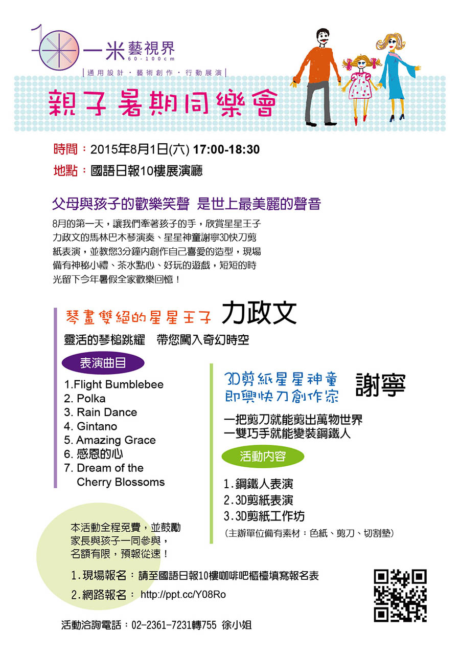 今年的暑假 大手牽小手 親子同樂齊創作 星星王子力政文帶來馬林巴木琴演奏 靈活的琴槌跳耀 帶您闖入奇幻時空 星星神童謝寧3D立體剪紙表演 一把剪刀就能剪出萬物世界 教您3分鐘內創作造型 現場備有神秘小禮、茶水點心,全程免費(含素材) 預報從速唷!