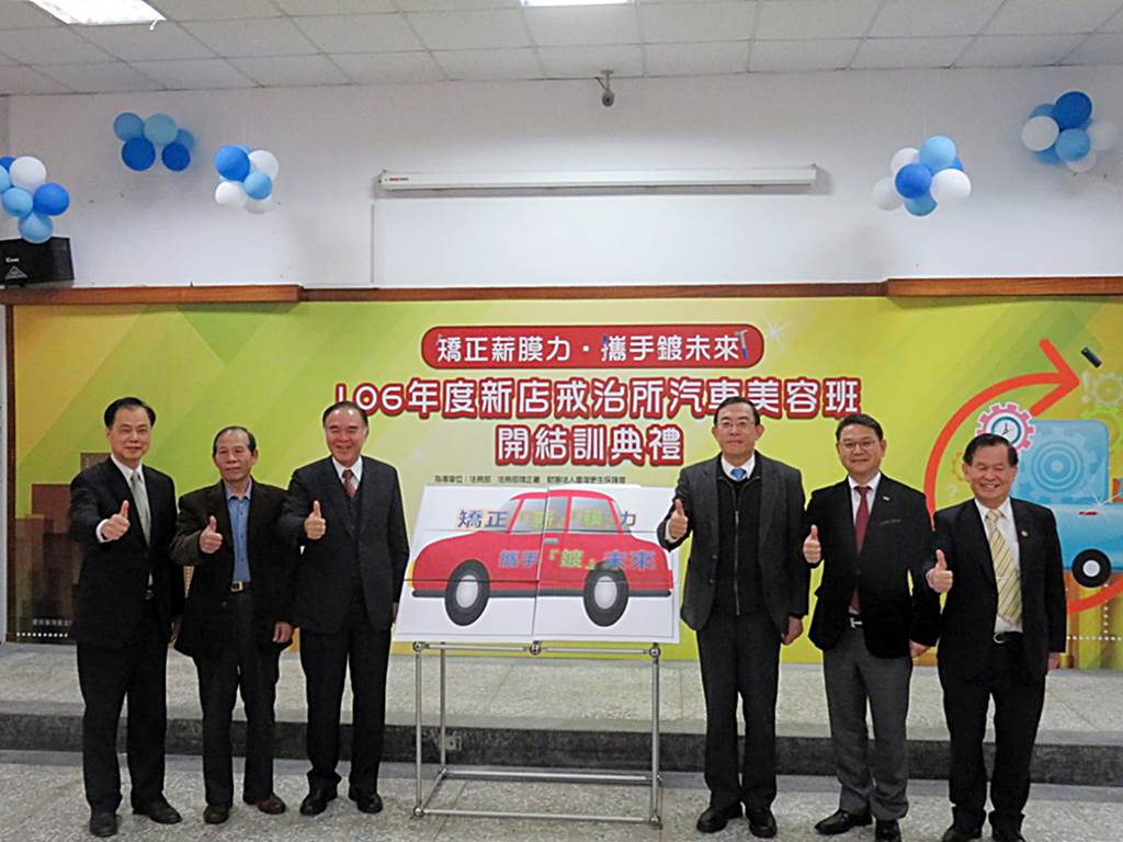 為鼓勵毒品收容人能重新尋回人生的目標,自105年起透過臺灣更生保護會臺北分會結合金翼詮汽車有限公司、瑞晟汽車有限公司及國立台北科技大學,首次引進日本專利鍍膜技術共同舉辦「汽車美容建教合作案」,第一批學員經過近4個月的努力,共有12名學員完成初級課程,於106年2月14日下午2點假新店戒治所中正堂舉行「矯正薪膜力.攜手鍍未來」汽車美容建教班結訓典禮。
