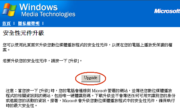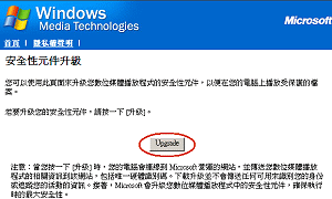 如無法執行上述操作,或執行後仍無法收聽,可自行連結至「微軟公司安全性元件升級網站」 或 http://drmlicense.one.microsoft.com/Indivsite/zh-tw/indivit.asp?force=1,按下「Upgrade」鍵後進行安全性元件升級。