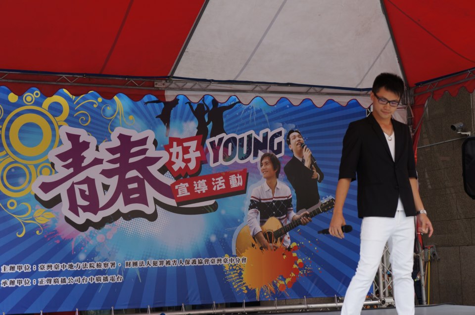 台中地檢署、犯罪被害人保護協會台中分會主辦,正聲台中電台承辦之『青春好YOUNG』活動,8/19下午於一中商街水利大樓廣場熱情引爆,吸引一波波青少年朋友及民眾同樂,活動中金曲歌手王宏恩、模仿秀達人李泳杰及正聲閃亮之星歌手等,均帶來多首動聽的歌曲,並提醒在場的每一位參加的朋友,絕不酒駕飆車、不吸毒,要做一位健康守法的青春少年兄!