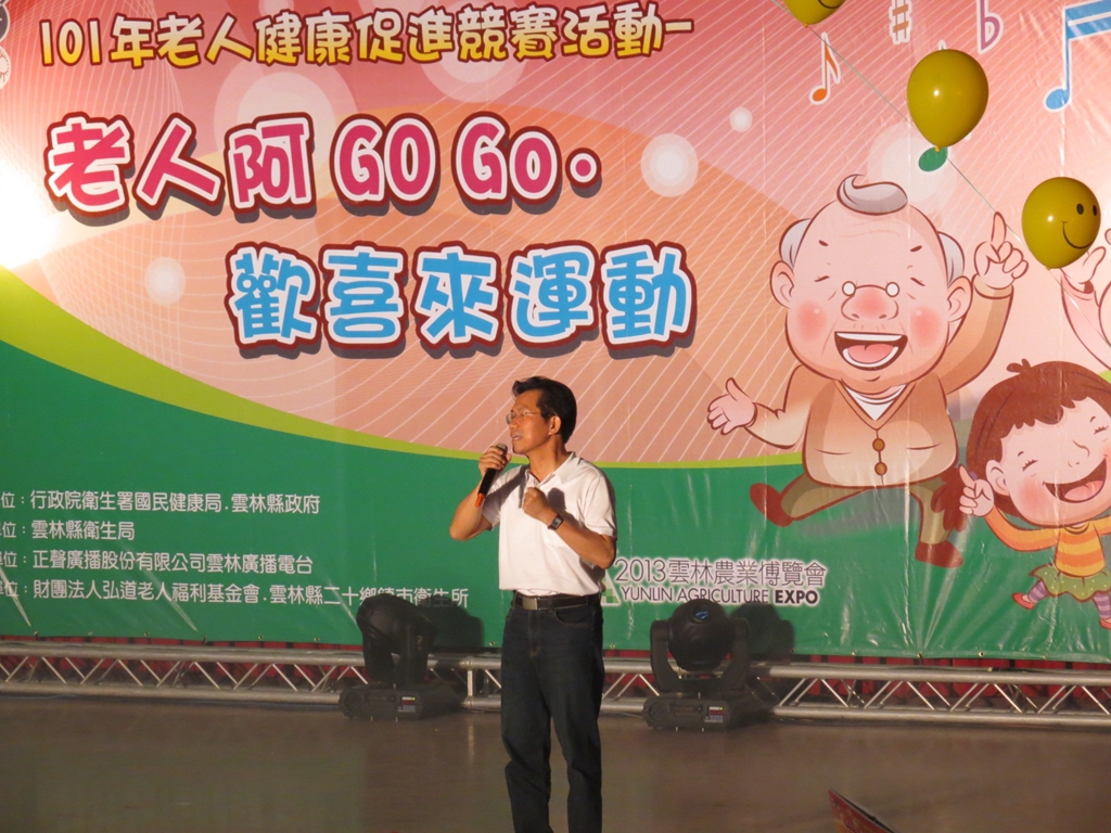 “老人阿GO GO,歡喜來運動”健康促進競賽活動,雲林縣二十鄉鎮各派出菁英代表隊,以舞蹈、武術、音樂、歌唱或民俗表演等不同型式展現雲林縣長輩的活力。競賽中選出前三名的隊伍頒發獎座及獎金,第一名隊伍可獲得一萬元獎金並代表雲林縣出賽,參加國健局所舉辦之”健康101,長者動起來”全國銀髮族健康促進賽,與全國各縣市代表隊伍PK,爭取最高榮譽。縣長蘇治芬為了鼓勵參賽隊伍認真比賽,第一名隊伍還特別加碼一萬元。比賽結果由四湖鄉~樂齡老來俏隊伍以凸顯在地特色的表現方式奪冠,二崙及斗六分獲二、三名,競爭相當激烈。