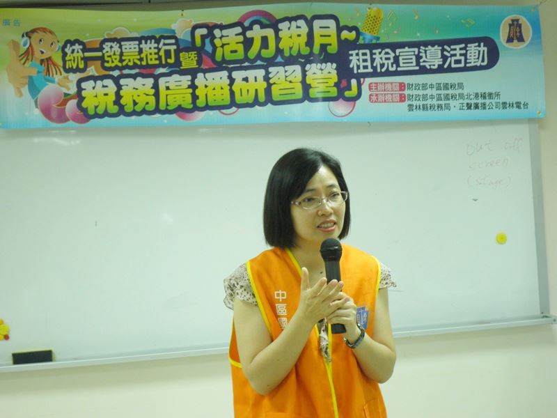 今年暑假最讚的活動,由中區國稅局北港稽徵所舉辦的「統一發票推行暨活力稅月–稅務廣播研習營」,10日在雲林台熱鬧展開,第一梯次有來自中部5縣市將近50位大專院校、高中(職)學校學生參加,讓電台生氣蓬勃。中區國稅局北港稽徵所審核員林淑絹表示,為了讓租稅知識能夠藉由熱鬧活潑的廣播課程,並透過廣播劇的演出讓同學們了解稅務常識,使其成為稅務小尖兵,將租稅常識種子散播校園中,所以特別結合正聲雲林台舉辦這項活動。