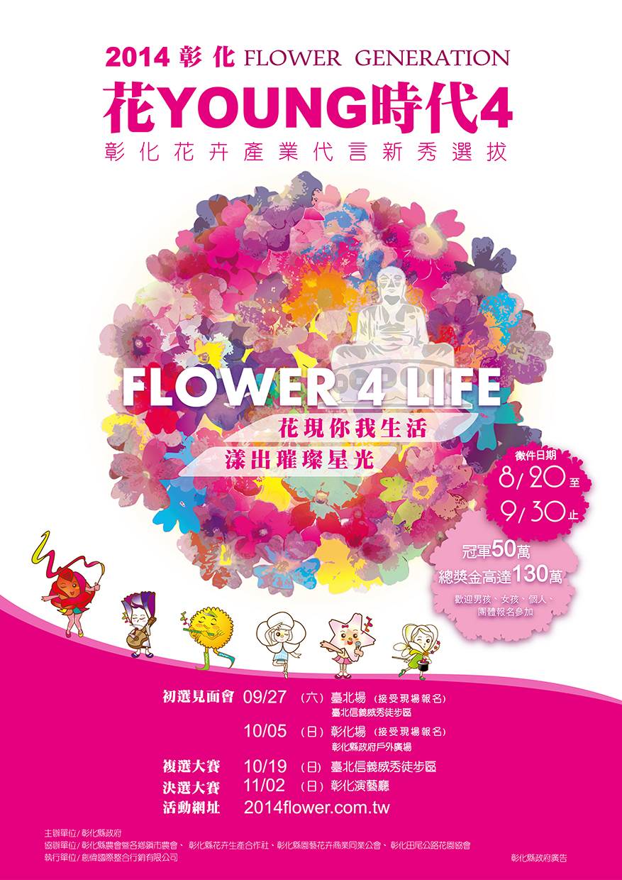 為延續並擴大花卉產業代言人所帶動的產業經濟效益,彰化縣政府再度舉辦「2014彰化花young時代」全國選拔活動,活動祭出總獎金新台幣130萬元,尋求最佳產業代言人!今年亦擴大參賽資格,報名時間從即日起至9月30日止,不分男女、個人或團體,只要對花卉行銷擁有熱情、活力,皆可報名參選,為讓更多民眾參與,爭取代言榮耀,特別開放現場報名!