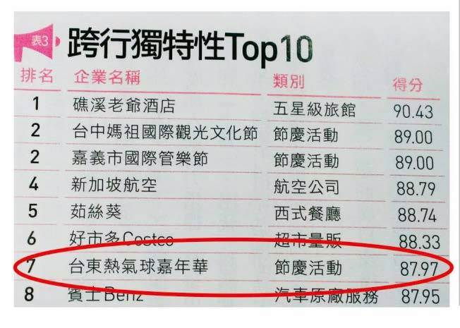 今年,天下雜誌又增加了「跨行獨特性」的評比,還是名列前十名,臺東的熱氣球受歡迎的程度可見一斑。