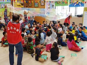 上午的演出,由四位演員飾演喜歡用新鮮的眼光看事物,按照著直覺到處旅行的好朋友,透過他們所經歷的神奇體驗,帶領孩子發現肢體與想像力的無限可能;體會只要用心觀察,生活周遭隨處都是有趣的風景。演出過程中,正聲嘉義電臺的工作人員也配合擔任臨時演員,雖然事前已彩排多次,但因不是專業演員的臨場緊張糗態,反倒更增添演出的效果,讓小朋友更加投入,情緒嗨到最高點。